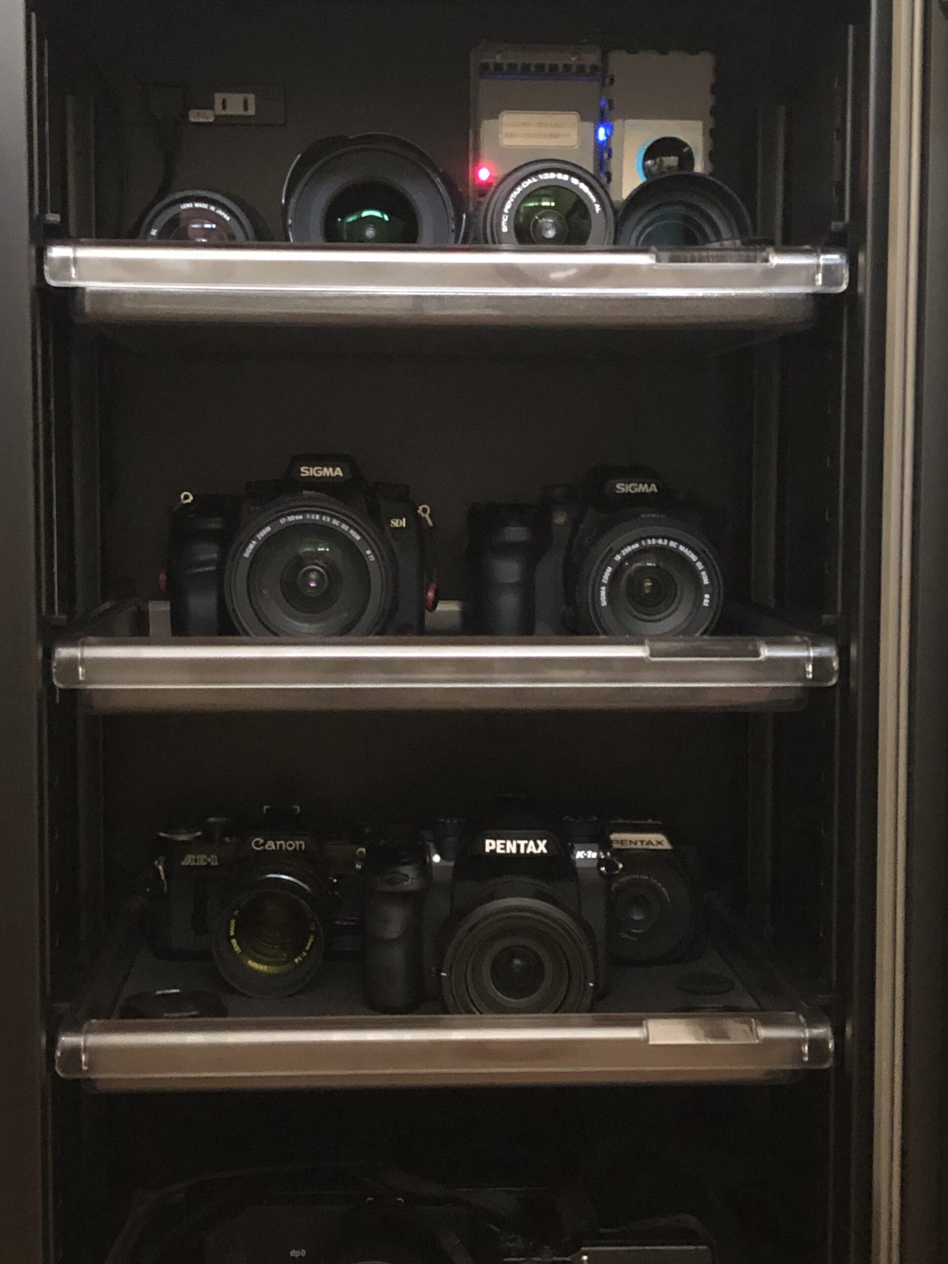 荷受けした際には大きすぎたと感じましたが、カメラやレンズを入れてみるとちょうど良いようでした。この防湿庫が溢れないように、自制したいと思います。